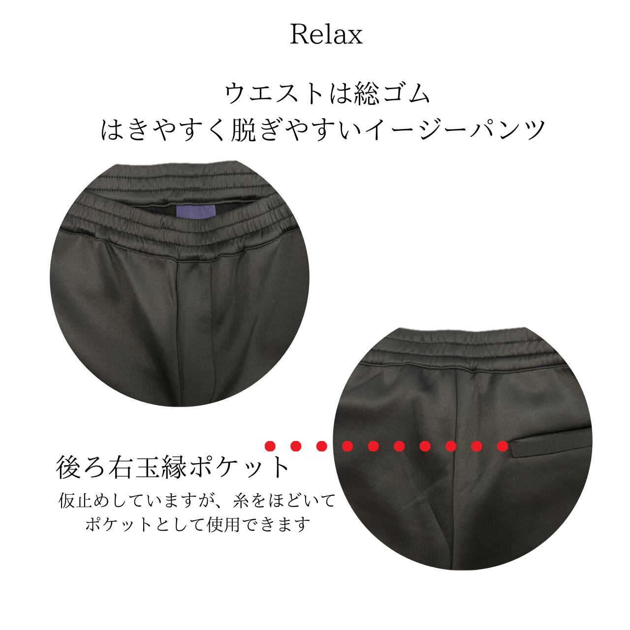 裏なし・ウエストゴム使用・前左右ポケット・後ろ玉縁ポケット